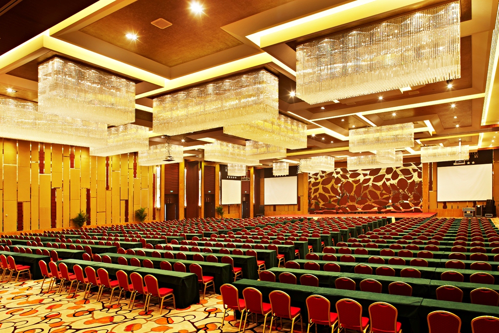 1570平方米的昆泰大宴会厅,内饰设计突现中式建筑的尊贵与雍容,炫目的巨型吊顶水晶灯散发金色的光芒,使整个大厅更显得富丽堂皇。 8米挑高空间以及无柱式的设计,方便将您的各种宴会设想变为现实。